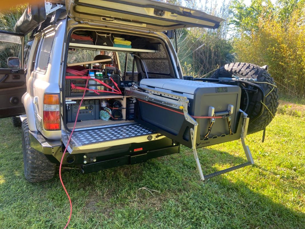 Design et fonctionnelle, la malle réunit une cuisine, des rangements astucieux, une glacière (couplée à la station d'énergie) et un couchage pratique via un système télescopique.