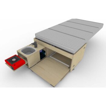 Elle comporte un tiroir de cuisine ingénieux qui renferme tout ce dont vous avez besoin pour préparer des repas simples en camping, y compris un robinet autonome avec une bassine pliable, deux réservoirs d’eau de 5 litres chacun, et un réchaud en inox. De plus, il y a une boîte amovible qui vous permet de ranger la vaisselle, une poêles et casseroles. A droite la tablette coulissante vous permet d’installer une glacière, batterie etc.